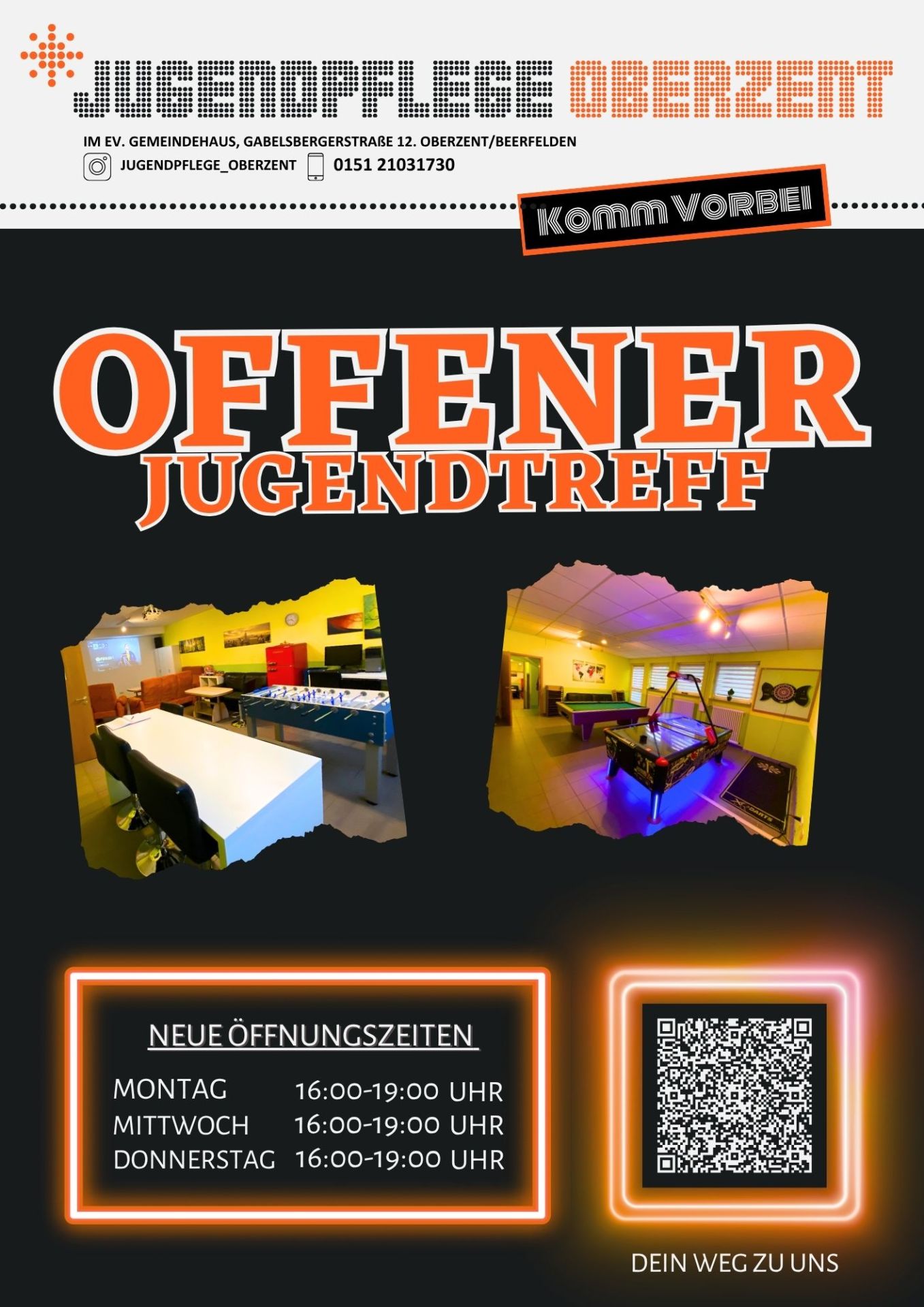 Im Jugendraum, welcher sich im Ev. Gemeindehaus in Beerfelden befindet, könnt ihr nach Herzenslust Billiard, Dart, Airhockey, Ps4, (Fifa) und viele weitere Karten, - Würfel oder Gesellschaftsspiele spielen oder einfach nur Chillen und die Zeit mit euren Freunden verbringen. Wer will kann sich dazu auch eine Pizza mitbringen. Eine Küche zum Kochen ist vor Ort. Falls du einen PC zum Bewerbung schreiben brauchst oder Informationen für ein Referat brauchst, kannst du auch gern vorbei kommen.